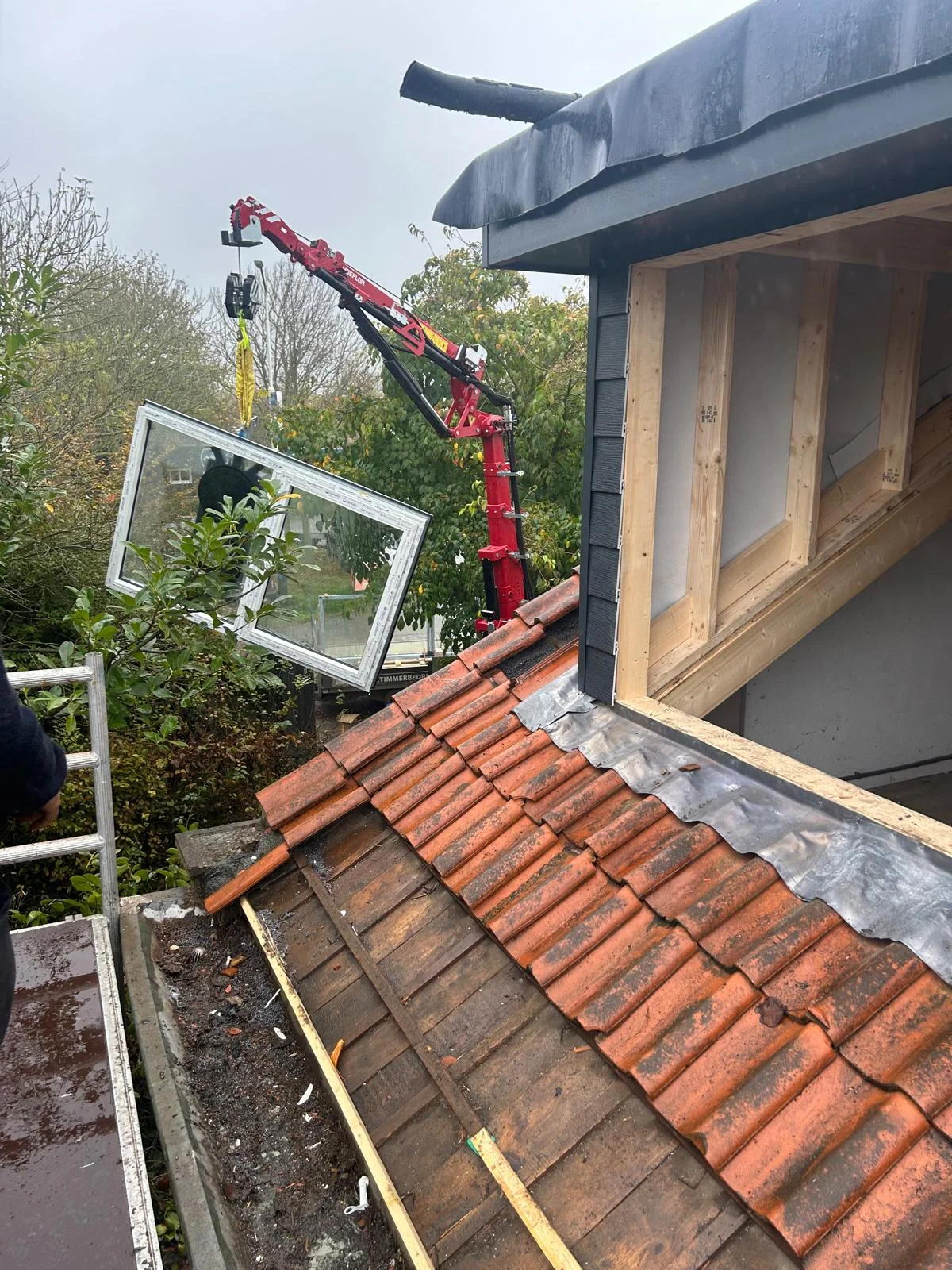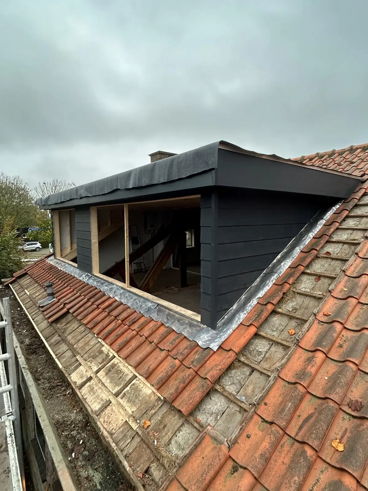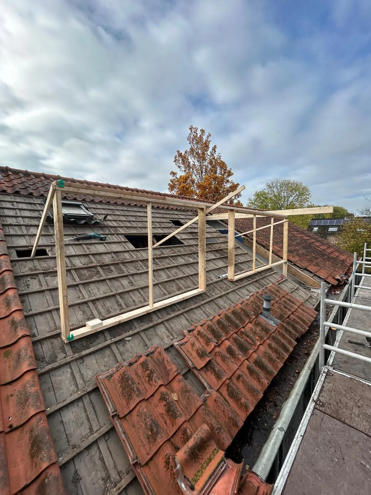 Omdat er al een kleine dakkapel aanwezig was, begonnen we met de afbraak hiervan. Vervolgens kozen we ervoor om niet direct het hele dak open te zagen, maar eerst op het bestaande dak te bouwen – rekening houdend met weersomstandigheden. Toen dit deel klaar was, hebben we alles netjes weggezaagd en afgebouwd. De voorkant en zijkanten zijn bekleed met keralit, terwijl het dak werd voorzien van EPDM dakbedekking. Tot slot hebben we de kozijnen geplaatst, waarmee de dakkapel volledig waterdicht werd gemaakt.